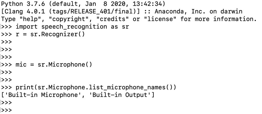 Before defining our microphone instance, we will choose our input device. There might be multiple input devices plugged into your computer and we need to choose which one we are planning to use. As you know machines are dummies, you have to tell them exactly what to do! Using the following code you will be able to see your input devices.