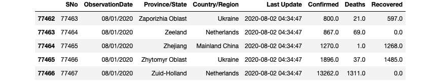 - Last Update — Time in UTC at which the row is updated for the given province or country. (Not standardized and so please clean before using it)