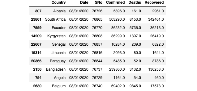 For this project, which is building an interactive map, we will focus on Country and Confirmed columns. We will do this filtering under Data Preprocessing step. Let’s import the data and explore it.