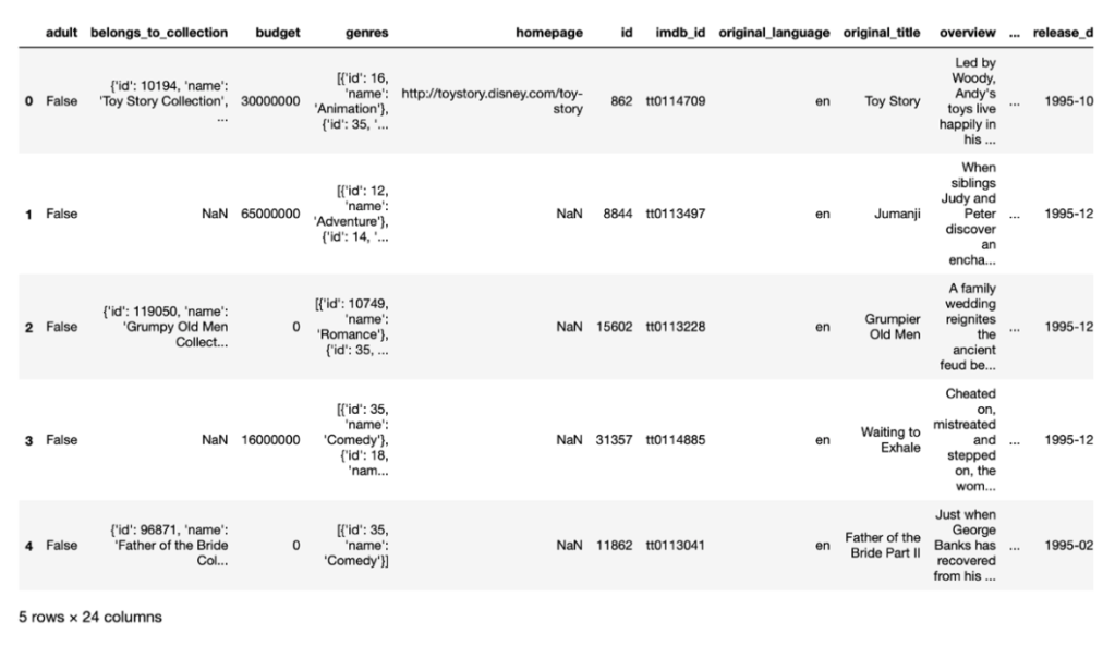 First things first, let’s start by importing and exploring our data. After you download the data folder, you will multiple dataset files. For this project, we will be using the movies_metadata.csv dataset. This dataset has all we need to create a movie recommender.