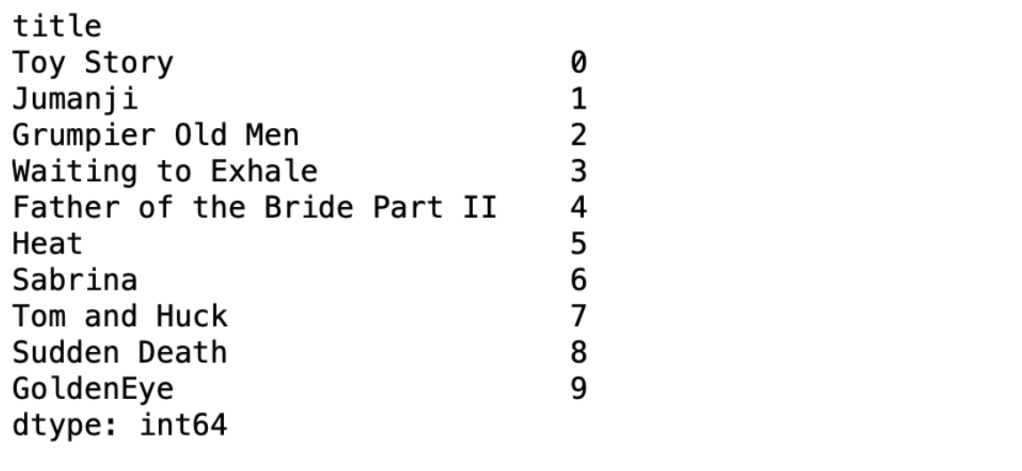 indices = pd.Series(movie_data.index, index=movie_data['title']).drop_duplicates()indices[:10]