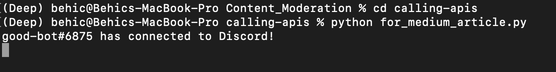 Congrats! We learned how to build a Discord bot and connect it with a cloud-based speech-to-text API in this article. Our program has returned the labels and timestamps where potential unsafe topics are discussed. This project can be improved by adding the functionality of cropping out the detected timeframes from the original video.