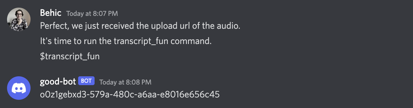 - $transcript_fun: the bot will run the get_transcription function and print out the request-id in the chatbox.